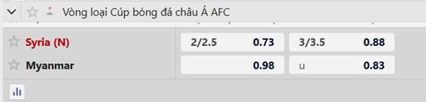 Syria đang được đánh giá cao hơn rất nhiều cùng tỷ lệ chấp lên đến 2 1/4 bàn. Hai đội từng nằm cùng bảng ở loạt trận vòng loại 2 World Cup 2026 và Syria bất bại 2 lượt trận trước Myanmar. Dù đội khách đang có màn thể hiện khá ổn nhưng với vị thế cùng đẳng cấp quá vượt trội, khả năng cao Syria vẫn sẽ thắng đậm và thắng luôn kèo châu Á.