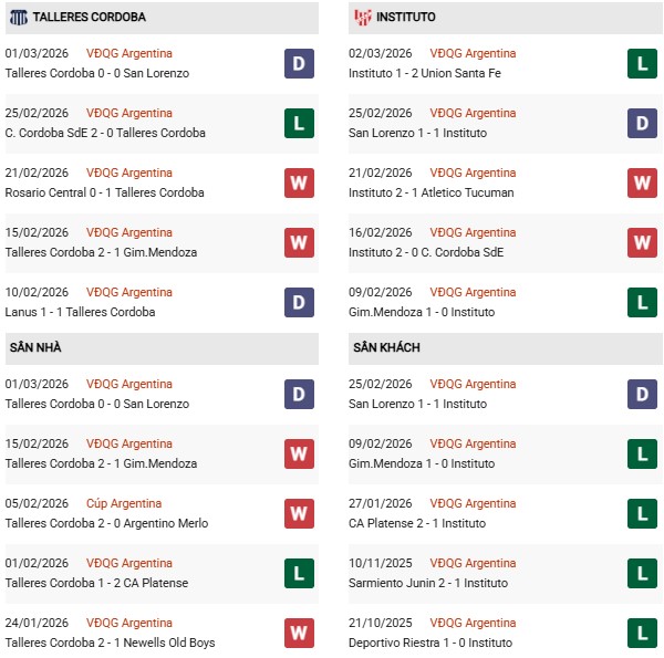 - Trên sân nhà, Talleres Cordoba thắng 2, thua 4 trước Instituto.