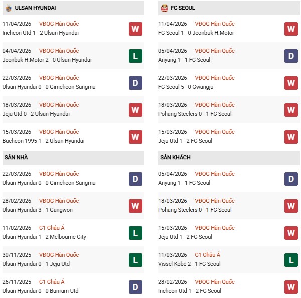 Ở phía bên kia sân, FC Seoul lại đang có phong độ cực kỳ ấn tượng. Họ bất bại sau 6 vòng đấu với 5 chiến thắng và 1 trận hòa, qua đó dẫn đầu bảng xếp hạng với 16 điểm. Đáng chú ý, hàng công của Seoul thi đấu rất hiệu quả khi liên tục ghi bàn, trong khi hàng thủ cũng duy trì sự chắc chắn.